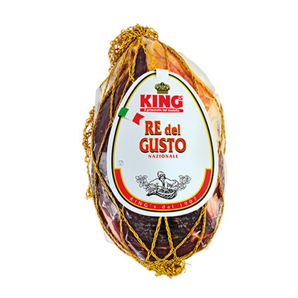 Selezionato dalle migliori cosce suine ITALIANE, Il Re del Gusto King’s si compone della parte anatomica del fiocco. Si ottiene da cosce suine “pesanti” con un’quilibrata quantità di magro/grasso. Il Re del Gusto King’s è il classico crudo tascabile, ideale per un consumo familiare. Il gusto risulta essere dolce al palato e morbido di gusto. L’aroma è profumato ed inconfondibile. Il Re del Gusto stuccato è un prodotto che arricchisce il banco gastronomia delle più rinomate salumerie.
