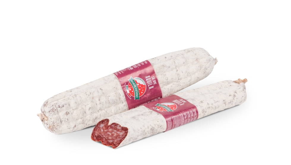 Fiore all’occhiello della gamma dei salumi da asporto, il salame Aquila, dalla tipica forma piatta, è preparato con carni selezionate completamente denervate e insaccato in budello naturale. Di provenienza dell’entroterra abruzzese, area marsicana, l’ “Aquila” ha macinatura fine ed un gusto inconfondibile. In pezzature di circa kg 0,400, oppure kg 0,250 (Aquilotto). Prodotto vincitore del “Premio Qualità Abruzzo 2016” come miglior salame.